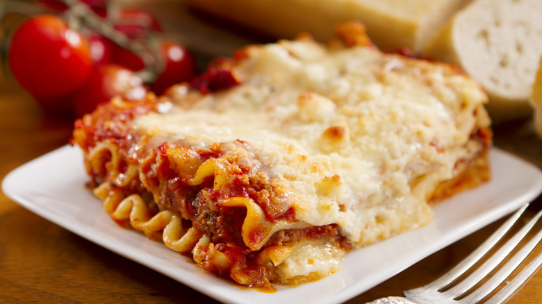Alternative cheeses aren't the only recommendation Chef Mirabile has for lasagna lovers. He also weighed in on the best practices for the tried-and-true ricotta and mozzarella cheeses as well. When asked whether to use fresh mozzarella for lasagna, Mirabile said that its juicy, melt-in-your mouth texture is not baking material. He says, "Low moisture mozzarella is much better when baking because it does not make the lasagna watery."