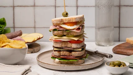 The Dagwood sandwich is more of a concept than a precise recipe, with the idea centered around creating a comically large sandwich filled with a wide variety of ingredients, meaning that you can really push the boat out when it comes to what you choose to include. There are just a few important rules to stick to. Firstly, it must be large, and not just a little bit big. It needs to be tall enough that you can't get your mouth around it to take a reasonable bite. Secondly, it should contain a variety of different luncheon meats and cheeses, like the comic strip. And finally, a proper Dagwood should really be finished off with an olive on the top. Include these three elements, and you'll have yourself a Dagwood sandwich.