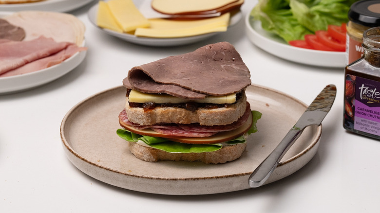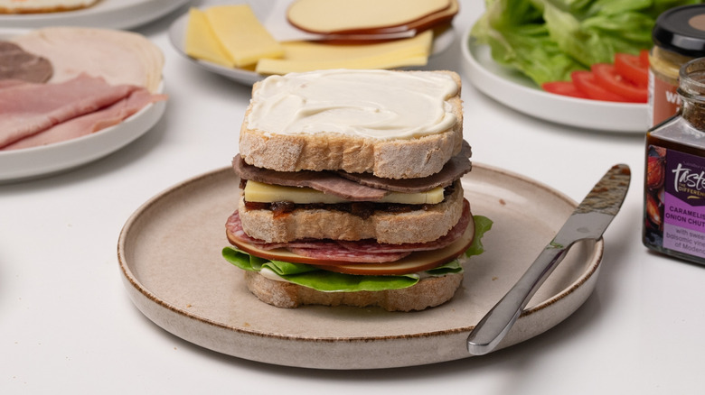 To begin this loaded Dagwood sandwich recipe, first you will need to gather the ingredients. You will want butter, an egg, white farmhouse bread, mayonnaise, lettuce, caramelized onion chutney, a salad tomato, pickles, wholegrain mustard, and an olive. For the cheese you will additionally want Bavarian smoked cheese, cheddar cheese, and Gouda, and for the meat fillings you will need salami, roast beef, turkey, and thinly-sliced ham.
