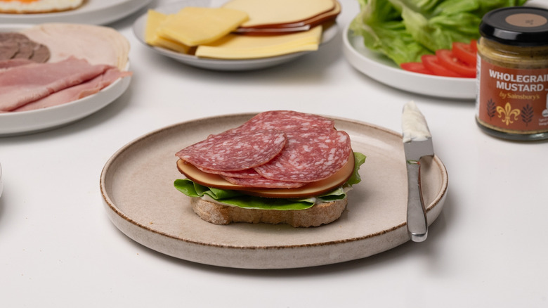 - Begin assembling. Smear 1 tablespoon of mayonnaise onto the bread then top with a large lettuce leaf, the smoked cheese, and the salami.