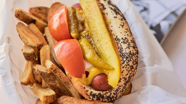 Hot dogs are as American as, well, hot dogs, but no place in the country loves them quite like Chicago. In a city where every neighborhood has its local hot dog spot, the quintessential dog is accentuated with a true salad of toppings, for something made to be a meal all by itself. Proper condiments are the sweet and tangy combination of mustard and neon-green relish — but never ever ketchup. On top of that you get sliced tomato, onion, pickles, and mildly spicy sport peppers, along with peppery, grassy celery salt, all on the equally essential poppy seed bun. It has just about every flavor you can think of on it, and each one works perfectly with a hot dog.