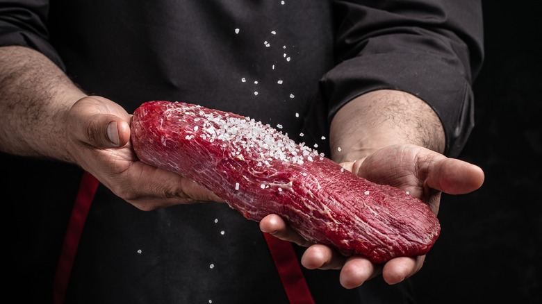 Tenderloin is one of the most sought-after cuts of beef, but if you want to see its full potential, you need to trust in the power of salt. Coming from the top of the cow's back, the tenderloin's appeal is right there in the name. As a muscle that doesn't get much work, the tenderloin is the most supple and tender cut of beef there is. Broken down, it gets turned into some of the most desirable and expensive steaks you can buy, like porterhouse and filet mignon. So, why is using salt right so essential for such a high-quality cut? It comes down to two other characteristics of tenderloin: It's an extremely lean piece of beef with little fat. This means it dries out easily, and since fat is flavor, it has a pretty mild taste. Salt can help with both, and the technique you need to be using is dry brining.