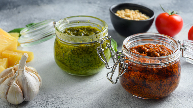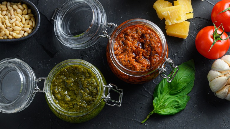 The switch in the ingredients used to make red pesto creates not just a stark difference in color but in taste, too. As we mentioned, red pesto has a sweet and tart flavor profile that tastes richer than green pesto. Green pesto, meanwhile, is nutty, salty, and herbaceous, with an earthy flavor. The green variant has always incorporated cheese, with traditional Genovese recipes calling for either Parmigiano Reggiano or Pecorino Fiore Sardo. The latter is a Sardinian product made of sheep's milk, with a slightly sweet and smoky taste that balances the flavors of basil, garlic, and pine nuts.