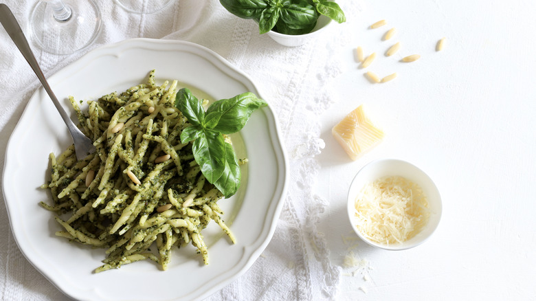 Pesto is a wonderful sauce to make, not just because of how packed with flavor it is but also because of how wonderful the kitchen smells after. An Italian food item with a history that goes back to the ancient Roman era, people love its herbaceous taste and aroma, which not only elevates pasta dishes but also tastes great on pizza and with chicken, fish, and roasted vegetables. It has such a universal appeal that folks tend to call any sauce that's made by blending green herbs, oil, and spices together pesto. The original, however, is pasta alla Genovese.