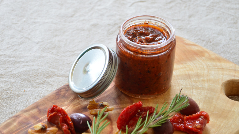 There's another type of pesto sauce that also comes from Italy, albeit from a region different from the one that created the classic green version. Red pesto is also known as pesto alla Trapanese, named after the Trapani town in Sicily, although you'll also see it called tomato pesto. It's equally versatile in the kitchen, serving as an all-around sauce suitable for pasta, pizza, sandwiches, chicken, fish, and veggies.