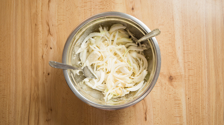 - Place the onions, breadcrumbs, flour, oil, and salt in a large bowl and toss well to coat.