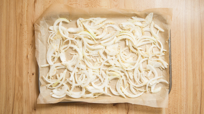 - Spread the onions evenly on two large baking sheets lined with greased parchment paper. If you don't have two large sheets, bake them in batches to avoid overcrowding them.