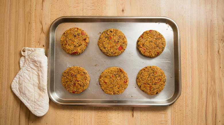 Another problem is the opposite — sometimes they are too dry and crumble apart, which is disappointing when you're trying to eat them on a bun. You'll need something to bind them together. While vegetarian burgers can use an egg, vegans will need to choose one of the best binders for vegan burgers. Some options are breadcrumbs, oats, chickpea flour, flaxseed "eggs," potatoes, beans, and quinoa flour.