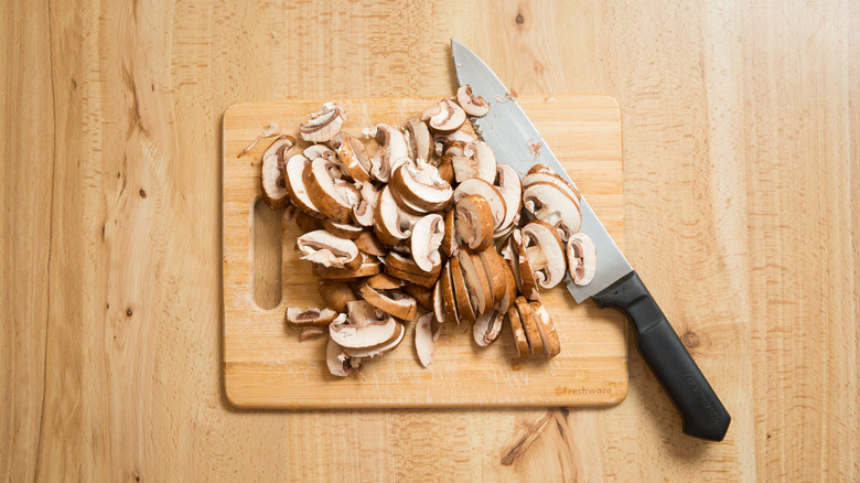 - Gently clean the dirt off the mushrooms with a damp paper towel before thinly slicing them.