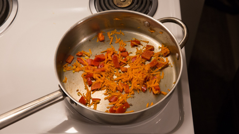 - Add the carrot and bell pepper and saute for 3-4 minutes until softened and any released liquid has evaporated. Transfer the mixture to the bowl with the mushrooms.