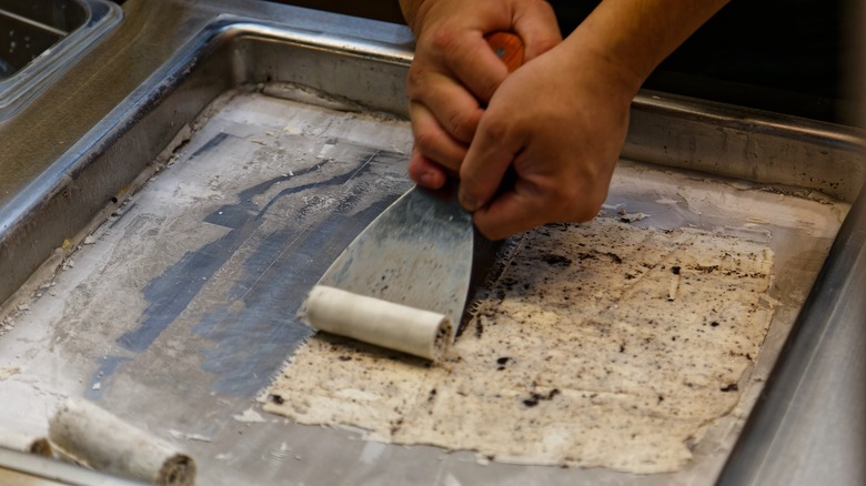 In a street market or ice cream parlor, the vendor probably has special equipment like a liquid nitrogen-cooled stainless-steel pan. That's important because the magic has to happen on an ultra-cold (-15 °C or about 5 °F) surface. That doesn't mean you can't try this at home. You can blend the ingredients and freeze overnight before rolling. It's just not as dramatic. Pour a thin layer of crème anglaise onto the cold work surface. As soon as it freezes, begin working the mixture. Using two metal spatulas, chop, flatten, and spread the cream while adding flavoring and mix-ins. When the mixture is smooth, spread into a thin layer, then use a spatula to scrape and roll individual strips.