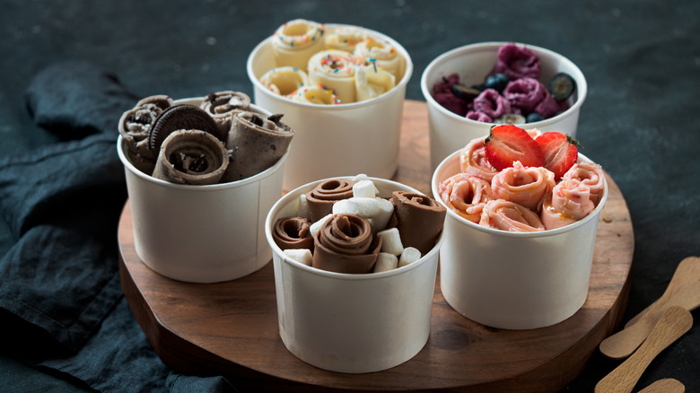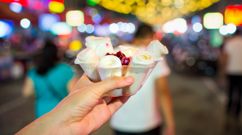 Daniel Gray, a food-marketing consultant in Seoul, has a theory. In 2017, Gray told The New York Times that in Asia, the texture of food is as important as taste. "You would never be served plain ice cream in a cup here," he said. "That would be too boring." Another important element? Presentation. Cuteness really counts. Factor in a bit of friendly competition among Asia's street food vendors to come up with the next and newest best thing, and you have an environment ripe for innovation. So, while ice cream with mix-ins may not be a groundbreaking concept, the rolled style of Thai ice cream rolls — they a look like a bouquet of rose buds in a cup — puts the confection in a whole new light.