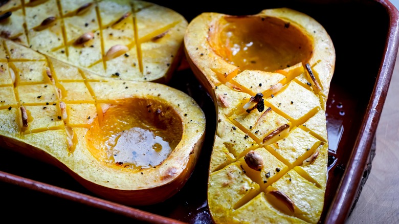 Now, the baked squash is delicious to eat as is — especially if seasoned first — but it's also a convenient way to prepare it for other uses. It's a cinch to scoop out the flesh with a spoon for recipes calling for pureed squash. Plus, as long as you don't overcook it or make it too soft, you can peel and cube the baked halves for when you need cooked cubed squash. It's much easier to peel and cut after baking, after all.
