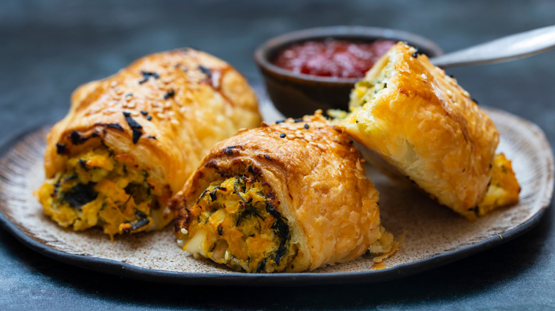 For a fun treat, these spooky spinach and butternut witch hat pastries are as tasty as they are unique. Perfect for Halloween party appetizers, these little creations are made from puff pastry that's shaped just like tall hats and coated in black sesame seeds to enhance the visual effect. The inside contains a garlicky butternut squash and spinach stuffing, because no one said butternut squash has to be boring.