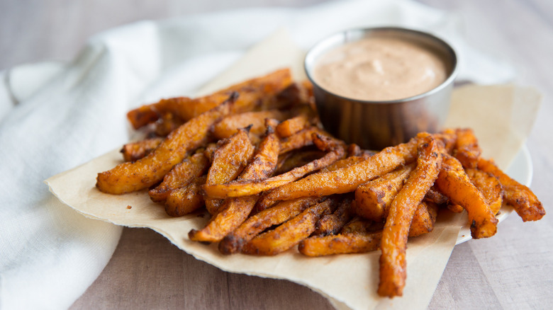 Most of the effort will be spent peeling and cutting the raw squash into equal-sized matchstick shapes, which will ensure they all cook and crisp up at the same rate. The secret is to toss the raw sticks with cornstarch to ensure they get extra crispy, before tossing them again with your favorite spices. We recommend paprika, cumin, garlic powder, salt, and pepper as a good starting point. All that's left is to bake the fries and serve them with your favorite dipping sauce.