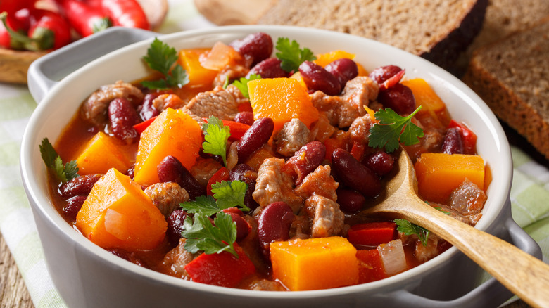 Butternut squash goes well with other ingredients usually seen in chili, like beans, peppers, tomatoes, and hot peppers. Just add raw cubed butternut squash right into the chili when you add the tomatoes and the beans. It will cook to creamy, fork-tender perfection while the stew simmers. If you'd rather not peel and cube a squash, adding canned butternut squash puree to chili about 20 minutes before it's done is another option. While you won't have cubes to bite into, the puree will add color and flavor while making the texture thicker and creamier.