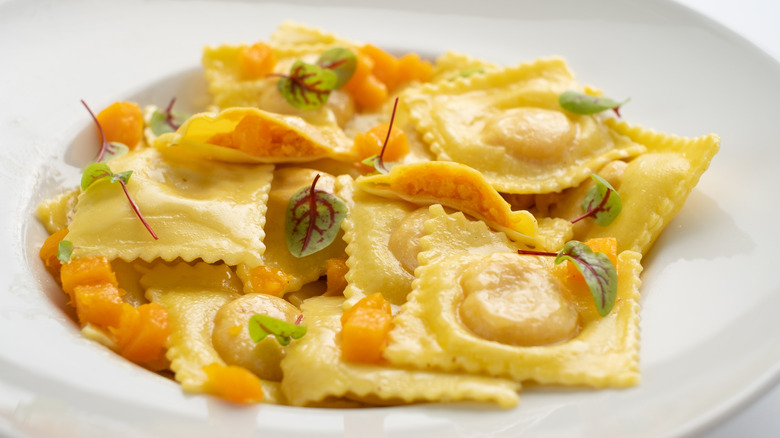 Risotto isn't the only Italian dish that can benefit from the addition of butternut squash. For instance, you can also make a filling for butternut squash ravioli with pureed roasted squash and ingredients like Parmesan cheese, nutmeg, hazelnuts, and even amaretti cookies to complement the sweetness of the squash. This filling is inserted into homemade ravioli and often served with a simple butter sage sauce.