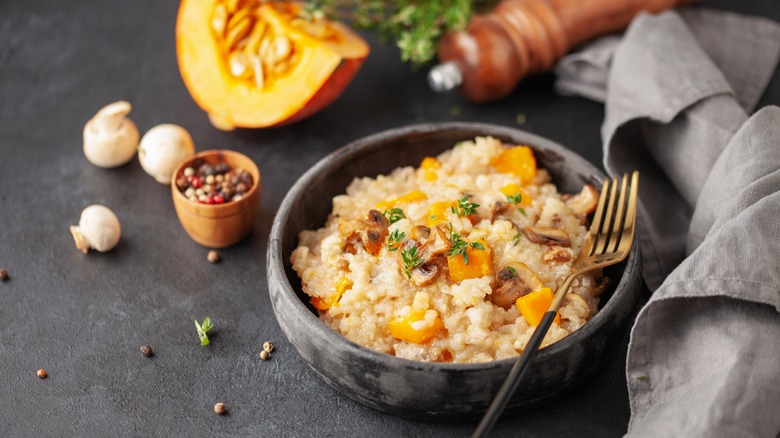 Risotto is an Italian rice dish that's slow cooked in broth until creamy. Risotto can be made with many different kinds of vegetables — including peas, radicchio, mushrooms, zucchini, spinach, and asparagus (just to name a few) — and usually includes cheese and butter for added richness. Since the sweet flavor of soft, cooked butternut squash complements the similarly textured risotto, it makes an excellent addition to this Italian staple.