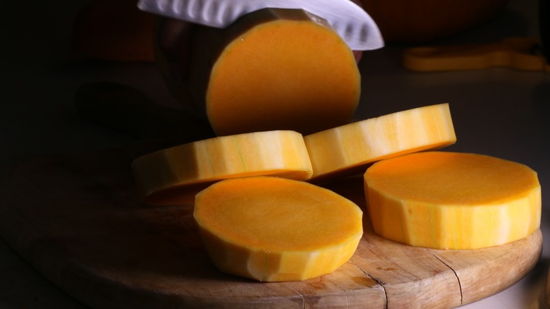 Butternut squash is a common winter squash with an elongated shape, pale skin, and vibrant orange flesh. Like the name suggests, these vegetables have a rich, creamy texture and nutty flavor that's often described as subtly sweet, which can be enhanced with cooking techniques that promote caramelization. This squash variety may be among the least expensive items at the grocery store, but it's a versatile ingredient that can wear many hats.