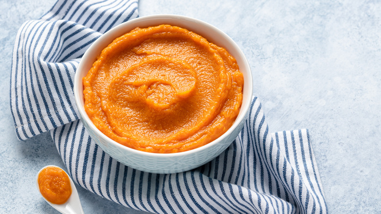 First, you can swap butternut squash puree for pumpkin puree in a pie recipe — and no one will know the difference. Of course, if you're looking for savory uses, there are plenty. Butternut squash puree is a gloriously easy pizza base that's just waiting for your favorite toppings. Butternut squash mac and cheese takes an already popular dish and makes it even richer, while adding vitamins and minerals. In the same way, butternut squash makes a flavorful and colorful fettucine Alfredo addition.