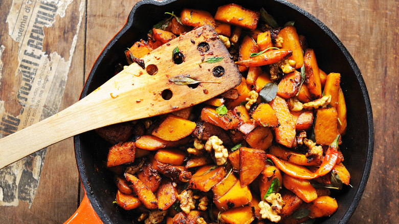 Though the crispy outside and tender inside of roasted squash cubes are always delicious, don't forget about sauteing, which is another great way to prepare this versatile vegetable. Sauteed squash has a bit of different texture than straightforward roasting. The exterior is more delicate and less crispy, but it still offers the same creamy interior and distinctive squash flavor. Plus, it doesn't take as long; roasting squash can take between 30 and 60 minutes (depending on the method you choose), while sauteed squash is ready in just 15 minutes.