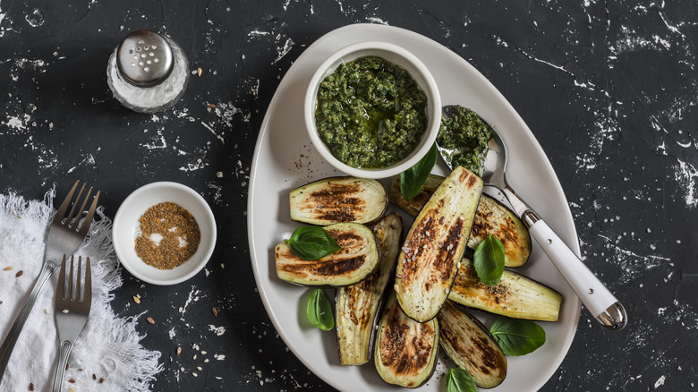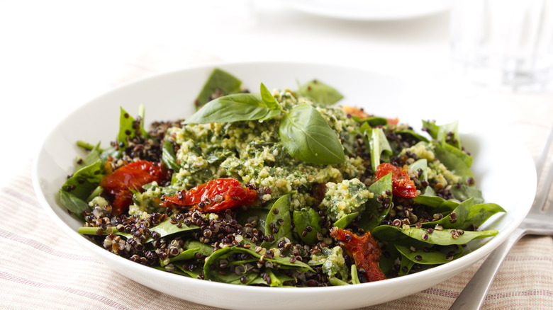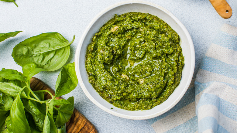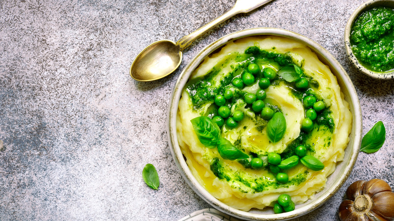 We can't talk about heavy dishes without mentioning the elephant in the room: the potato. While different potato preparations are, without a doubt, delicious, they can leave you feeling bogged down afterward. But when pesto is introduced, you'll find that your favorite spud sides have a new, unexpected vibrancy to them. It's the perfect sauce for mashed potatoes, and it's an especially easy upgrade to implement if you have a jar of store-bought pesto hanging around. Add a dollop to the taters after they're mashed and watch as the flavor transforms. If you are a fan of garlicky mashed potatoes, you can also add extra cloves for extra emphasis.