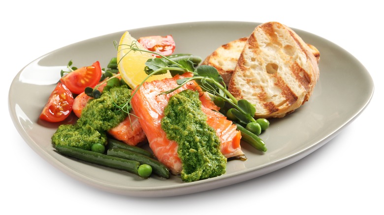 Salmon is one type of fish that's well-suited for a pesto drizzle. You can add it to your grilled filet, or try a pesto-crusted baked salmon to harness all things textural. Dorade, aka gilt-head or sea bream, is another fish that craves the herbal notes of pesto. Try to grill it whole and then slather it in pesto before serving.
