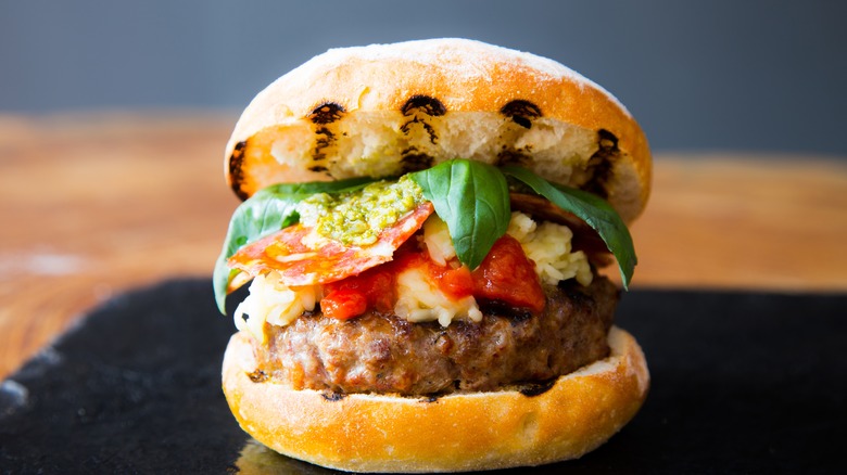 There are several ways you can add pesto to your sandwich. While a drizzle straight from the jar is always a solid option, you could also make a flavorful aioli base by combining the pesto with mayo, like in this basil pesto smash burger recipe. Add a couple of roasted red peppers on the top, and you have a dynamite sandwich that kicks the other condiments to the curb.