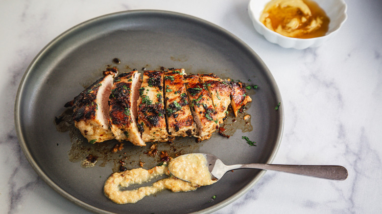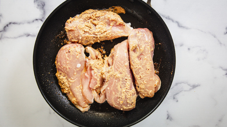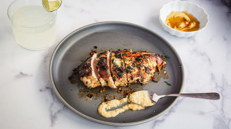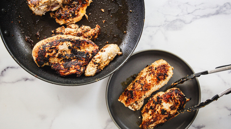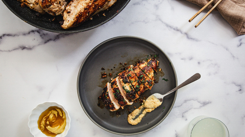 Once you've made this dish a few times, you can start playing around with its presentation, preparation, and even flavors. For starters, you can substitute chicken thighs for the breasts in this recipe. Chicken thighs tend to be more flavorful and juicy than breasts due to their higher fat content, but they may require a slightly longer cooking time to ensure they're fully cooked through. The best way to know when to stop cooking them is to use a meat thermometer and take the thighs off the heat when they reach an internal temperature of 165 F.
