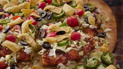 For the actual toppings, it's really a matter of what you like and don't like. Toppings that would be good on this enchilada sauce pizza include fire-roasted corn, black or pinto beans, refried beans (à la Taco Bell's Mexican pizza), jalapeños, red or green bell peppers, crumbled taco-seasoned ground beef, or flavorful grilled chicken. Bake your pizza according to the dough instructions or until the cheese is fully melted, then remove to cool.
