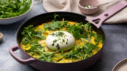 An elegant addition to any brunch table, this rich and savory flavor-packed asparagus and tarragon frittata is surprisingly easy to make. It just requires the baby potatoes and asparagus to be cooked and chopped separately, before being baked together with eggs, Gruyere cheese, and chopped tarragon. Top with a ball of creamy burrata and peppery arugula and serve with a side salad or salty chips to easily elevate your next brunch and impress your guests.