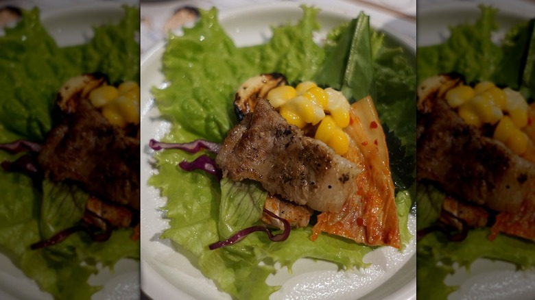 The U.S. is the second-top global buyer of Korean kimchi, after Japan, highlighting how this tangy, vibrant side dish is now a popular mainstream pickle among Western palates. This is why kimchi is a great place for newbies to start when eating banchan; it's a familiar food among the sometimes overwhelming bits and pieces of a classic Korean barbecue. Better yet, grilling the pickled cabbage is a breeze — just pop a few slices directly onto the grill until it takes on some color before flipping it over. Then enjoy your barbecued kimchi alongside your grilled meats or put them in a ssam, which is a leafy-vegetable wrap that usually contains meat, a spicy soybean and red pepper condiment called ssamjang, and a banchan of your choice. Much like assembling a taco, making a personalized ssam at the table is an enjoyable task and means you can create a mini wrap that features your favorite elements of a Korean barbecue. These might include a creamy potato salad, pickled radishes, or seasoned soybean sprouts. Just make sure to assemble a compact ssam because it should be eaten in a single bite.