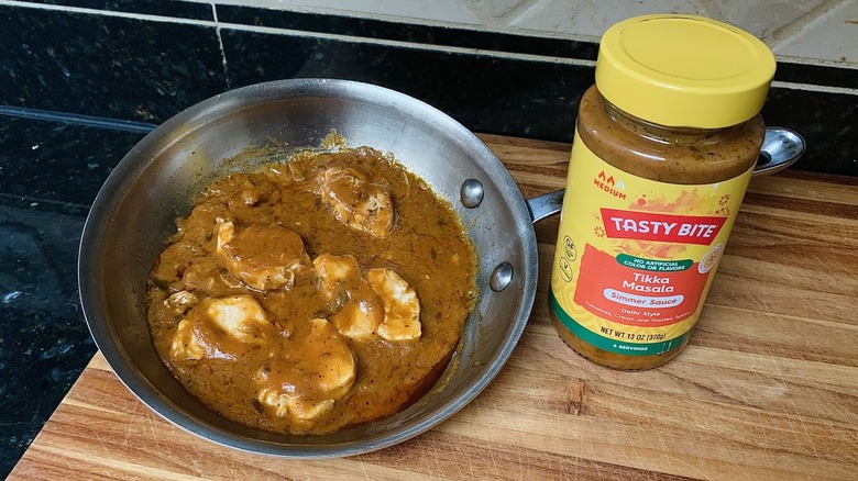 I cook Indian food at home several times a week, so if there's a way to cut down on time spent laboring over the stove, I'm in. To test the jarred tikka masala sauces for this ranking, I used each to create a semi-homemade meal. I prepared each dish by first browning chicken chunks in olive oil, then adding the sauce and simmering until the chicken was cooked through. My findings were first based on visual appeal. I then judged the dish on aroma, sauce consistency, and flavor, while also considering price.