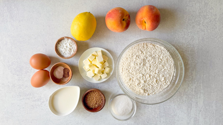 For this recipe you will use all-purpose flour as the base of the dough, sweetened with granulated sugar and leavened by baking powder. Fine sea salt and ground cloves season the dough and balance the sweetness. Freshly grated lemon zest adds brightness to complement the fresh peaches. Use unsalted butter to cut into the flour, and bring the dough together with a couple of large eggs and some heavy cream (a bit of cream will also be used to brush the tops of the scones).