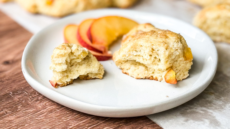 When choosing peaches for a recipe like the peaches and cream scones, select peaches that are firm but have a bit of give when pressed. This indicates that they have started to ripen. Kinnaird says that it is not necessary to peel the peaches for this recipe, as the peach skins soften while baking and add a nice burst of color to the scones.