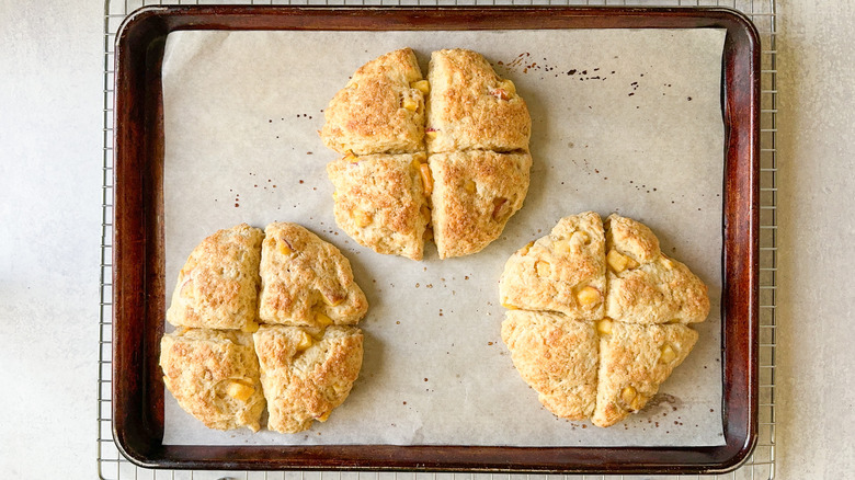 A warm, fragrant scone fresh out of the oven is a pure delight whether served for breakfast or with afternoon tea. Although scones may seem fancy, they are wonderfully simple, easy to prepare in just a few steps, and can be made in sweet or savory form. Unlike biscuits with their flaky and buttery layers, scones have a more dense texture with a tender crumb. Scones lend themselves to holding a variety of flavorings, from dried fruits and nuts to chocolate, herbs, or cheese. This recipe for peaches and cream scones – courtesy of recipe developer Julie Kinnaird – will show you how to mix fresh fruit into your scone dough for a true cream scone experience. These tender scones are bursting with fresh peach flavor and a hint of cloves, and are topped with a bit of crunchy turbinado sugar.