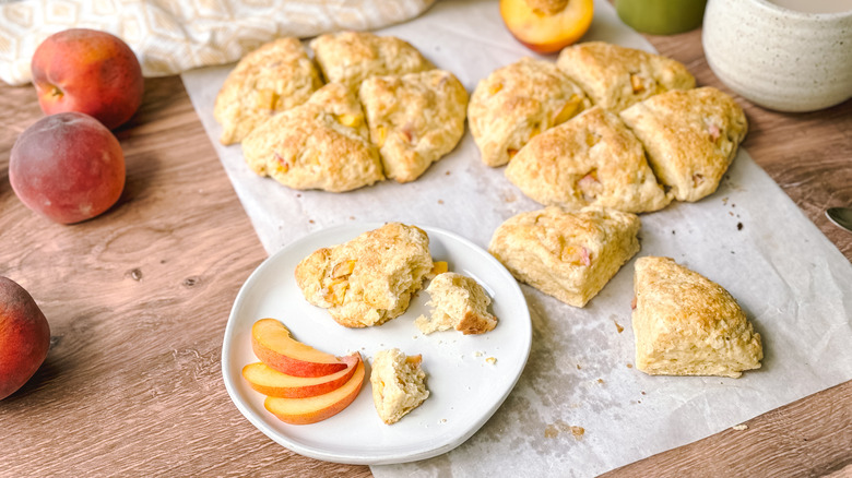 Tender scones bursting with fresh peaches and flavored with a touch of lemon and a pinch of cloves are perfect for breakfast or with clotted cream for high tea.