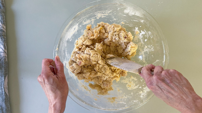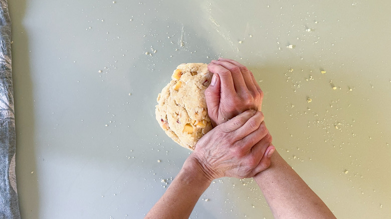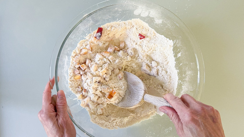- Add the egg mixture to the dry ingredients and peaches and stir just until a dough starts to come together.