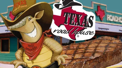 If the honky-tonk Texas setting doesn't suspend your disbelief, the resident mascot will. Andy the Armadillo has been keeping customers in good spirits since the beginning. He's another one of Taylor's genius ideas inspired by the restaurant's family-friendly concept and the Lone Star State, which happens to host the largest population of armadillos in America. If you're unfamiliar with these cat-sized armored creatures, the armadillo is Texas' official state small mammal. Its body is covered in a bony shell with scales that protect it from predators. Andy was born to the first Texas Roadhouse in 1993, and was a part of eating there.