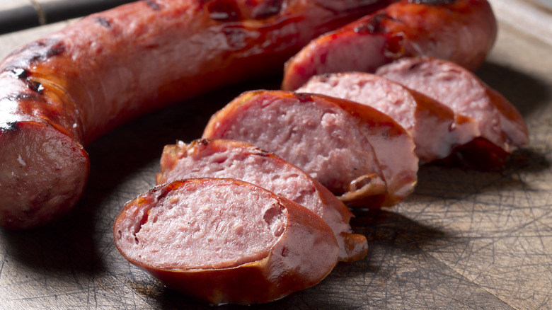 Traditionally, the sausage used in gumbo is andouille. This spicy sausage — brought to Louisiana by French immigrants and embraced by Cajuns — is made with pork, then smoked and precooked. It's delicious and has a lot of cayenne pepper. For a milder profile in your gumbo, kielbasa makes an amazing substitute without sacrificing flavor. Kielbasa is a Polish sausage that's also smoked and thoroughly cooked. Made usually with pork (but sometimes beef or venison), kielbasa has a strong herbal profile with the addition of marjoram and, like andouille, features garlic as a key ingredient. Because kielbasa is stuffed in a casing and then smoked for about three hours, the firmness of the sausage holds up just as well as andouille, especially during the slow cooking process involved with gumbo.
