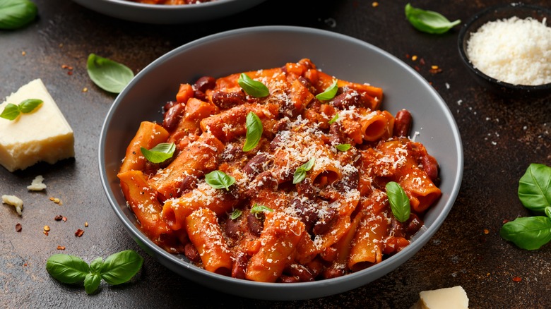 Indeed, if you make this dish at home, you'd be better off avoid long pastas like spaghetti or bucatini (unless you plan on breaking them up). You'll want to go for something bite-sized instead, like ditaloni rigati, which you can easily scoop into your mouth along with the beans. This Venetian stew is often made with local borlotti beans. Be sure to slightly crush some of those beans as they cook — this will give the dish the thick consistency it's known for.