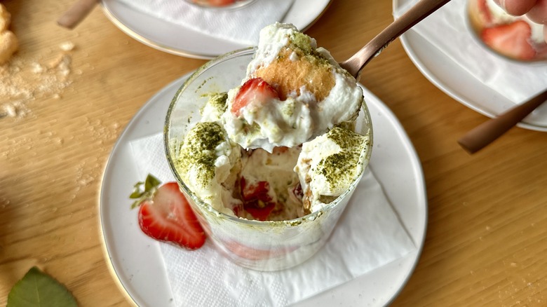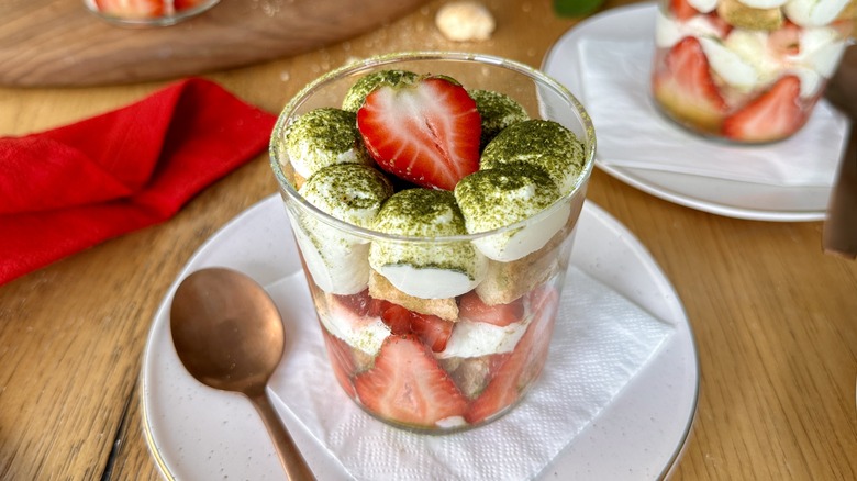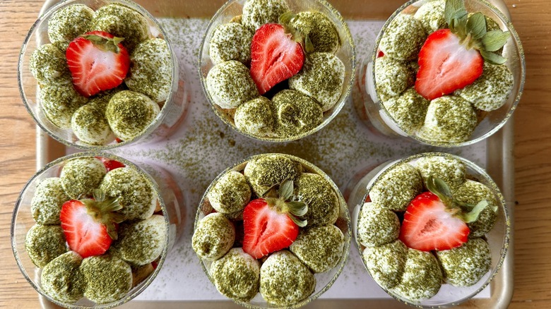 Trends come and go, but tiramisu has remained a staple on restaurant menus through the years for good reason — it's delicious! Deep, rich, and full of creamy, softly moist textures, eating this custardy layered dessert is more than just satisfying — it's an experience, albeit a somewhat outdated one. If you're looking to give new life to this old favorite, a bright, summery twist in the form of matcha strawberry tiramisu may just be the answer.