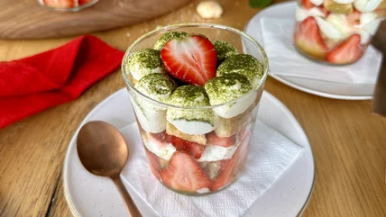 To make this summery dessert, a culinary-grade green tea powder is dissolved into a syrup made with water and sugar and brushed over chopped ladyfingers to add an earthy flavor and rich color to the cookies. Store-bought ladyfingers are a great shortcut here, although you can also make your own, if preferred, or swap with leftover cubes of vanilla or lemon pound cake or crumbled shortbread cookies for a unique twist. Fresh sliced strawberries add a sophisticated touch as they line the serving glasses. Additional strawberries are macerated in sugar and lemon juice for a punchy, tangy flavor that contrasts the creaminess of a whipped mascarpone cream. To make this cream, a ganache made with heavy cream and white chocolate is whipped until light and fluffy, with mascarpone added for stability and richness, vanilla for depth, and a hint of salt to balance the sweetness. You can also add rum in the place of the vanilla for additional complexity and a boozy twist.