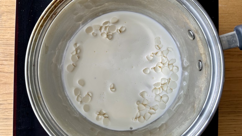 - In a small pot, whisk ⅔ cup heavy cream and white chocolate over low heat until melted.