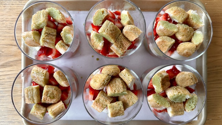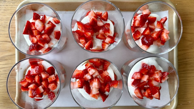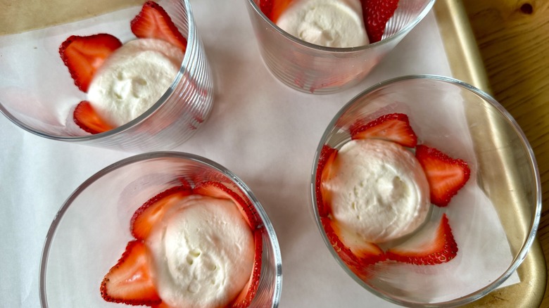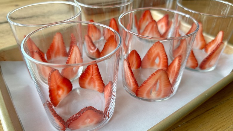 - Halve the remaining strawberries, and place one half into the center of each glass.