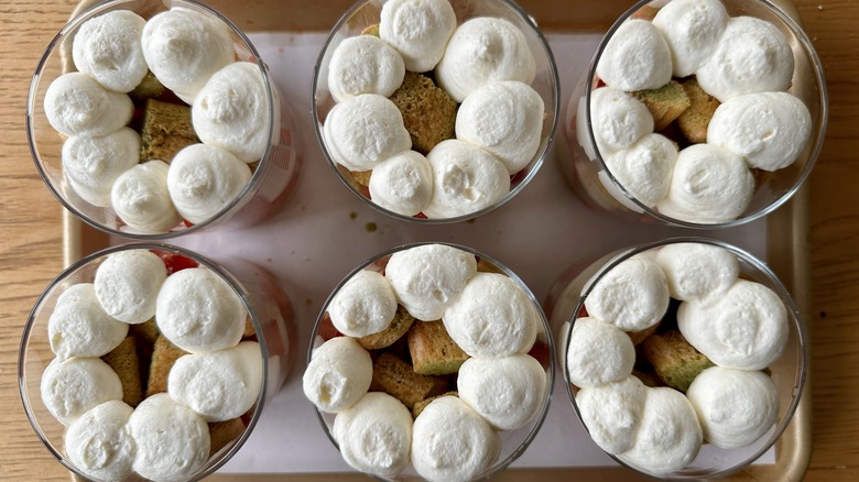 - Pipe a layer of mascarpone cream into the bottom of each glass.