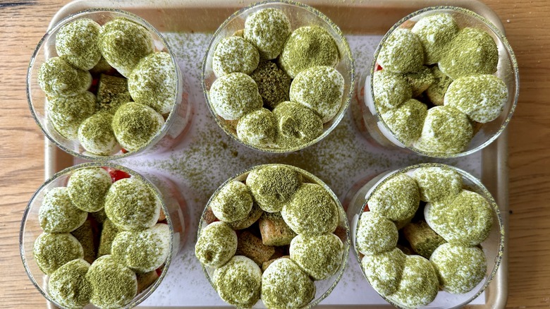 Sift the remaining 2 tablespoons of matcha powder over the cream.
