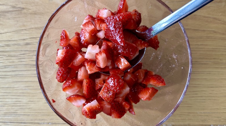 - Stem and dice 4 large or 5 small strawberries. Stir to combine with remaining 1 tablespoon sugar and the lemon juice. Set aside.