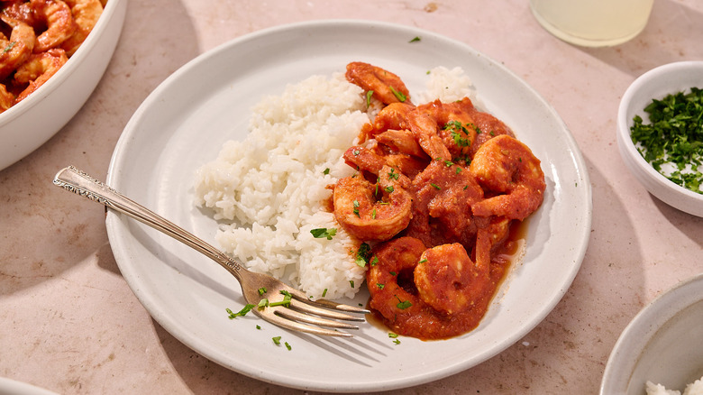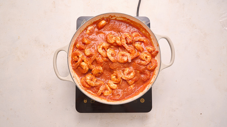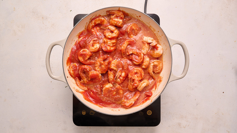 There's no one right way to make camarones a la diabla, as long as you end up with a bright red, spicy, saucy dish. Using tomato sauce or puree offers a super-saucy shortcut that effectively removes the need to roast, blend, and simmer fresh tomatoes — great for those who need dinner on the table in a pinch. For a fresher taste, though, and for those with more time to spend cooking, you can easily add fresh tomatoes to this dish instead.