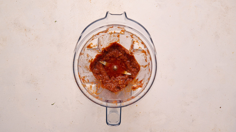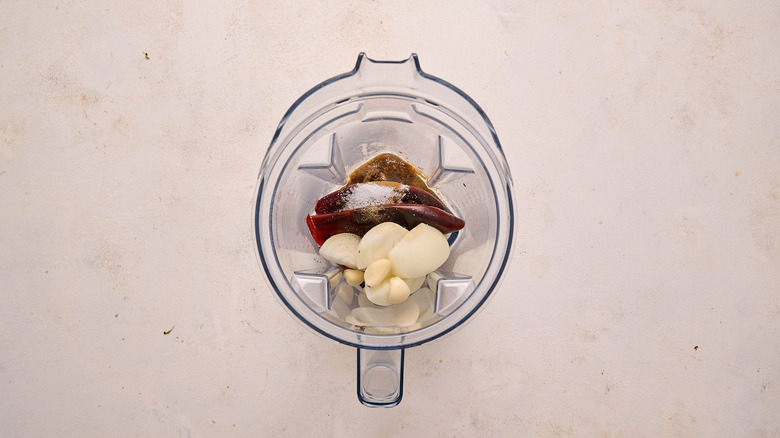 - Add the peppers and water, onion, garlic, chipotle chiles in adobo, salt, pepper, and cumin to a blender.